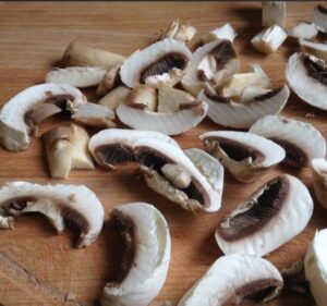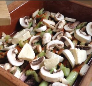 - Posudu za pečenje nauljiti, staviti špargle, beli luk, celerov list, šampinjone, mocarelu i začine.